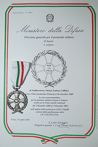 Nadkomisarz Tadeusz Łuksa ze Sztabu Policji KWP w Rzeszowie odebrał dziś medal za służbę na rzecz pokoju i współpracę z włoskimi karabinierami w ramach misji pokojowej EULEX. Odznaczenie przyznane przez włoskie Ministerstwo Obrony wręczył Zastępca Podkarpackiego Komendanta Wojewódzkiego Policji inspektor Andrzej Sabik.