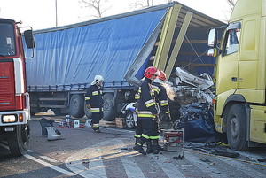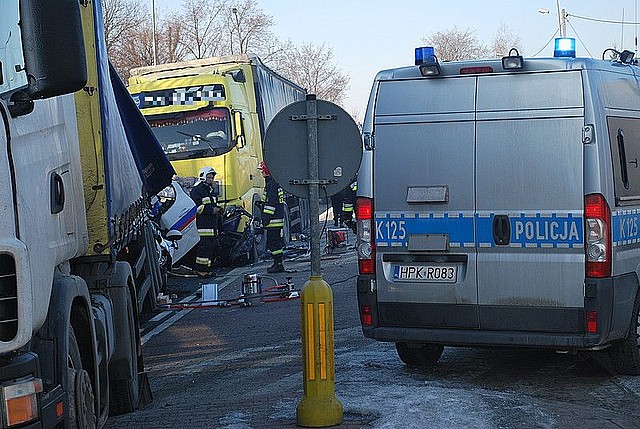 Policjanci i inne służby ratownicze pracują na miejscu tragicznego wypadku, do którego doszło w Boguchwale. Dwa samochody osobowe zostały zgniecione pomiędzy dwoma tirami. Zginęły trzy osoby.