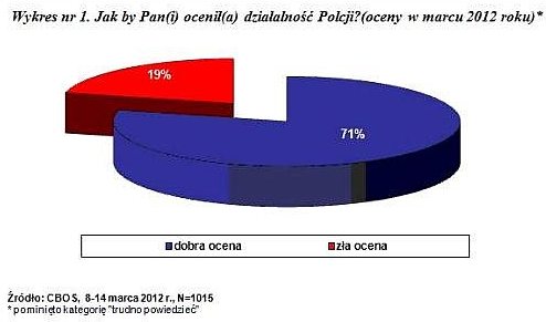 Większość Polaków dobrze ocenia działalność Policji. Z badania dotyczącego oceny instytucji publicznych, zrealizowanego przez Centrum Badania Opinii Społecznej w dniach 8 – 14 marca 2012 roku, wynika, że lepiej od Policji oceniane są tylko niektóre media.