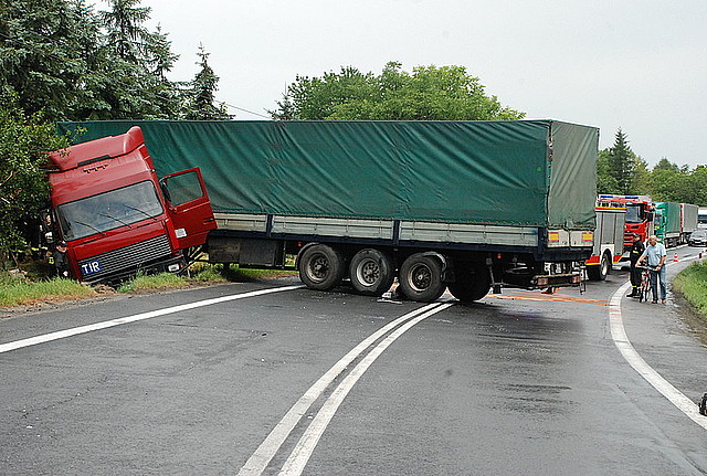 Do zdarzenia doszło około południa. Ze wstępnych ustaleń wynika, że w Lutoryżu na drodze krajowej nr 9 na łuku drogi kierujący samochodem ciężarowym wpadł w poślizg. W wyniku tego naczepa tira stanęła w poprzek drogi, a kabina ciężarówki wpadła do rowu. W naczepę uderzył kierowca bmw. Do szpitala przewieziono pasażerkę bmw.