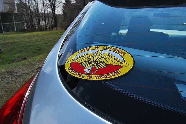 W trakcie działań członkowie Stowarzyszenia Motocyklowego za zgodą zatrzymanych do kontroli kierowców, we wskazanych przez nich miejscach, naklejali na samochody specjalne naklejki o treści: „Patrz w lusterka – motocykle są wszędzie”. Większość z kierowców chętnie zgadzała się na taki sposób włączenia w akcję.