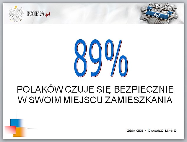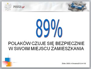 Aż 89 % Polaków swoje miejsce zamieszkania nazywa spokojnym i bezpiecznym – tak wynika z najnowszych badań CBOS-u z kwietnia 2013 roku. Ten rekordowo wysoki wynik poczucia bezpieczeństwa, najlepszy od 1987 roku, ściśle koreluje ze spadkiem przestępczości, zarówno tej poważnej przeciwko życiu i zdrowiu jak też tej bardzo uciążliwej społecznie np. drobnych kradzieży.