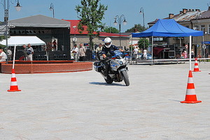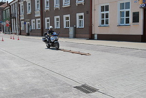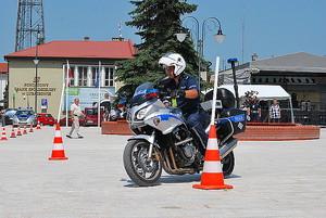 Drugą dzisiejszą próbą było "ujeżdżanie" służbowego motocykla. Każdy z policjantów pokonywał tor przeszkód, liczył się czas, a karne sekundy doliczane były za podparcie się nogą, za dotknięcie pachołka, za spadnięcie z deski i równoważni, wreszcie za ominięcie przeszkody.
