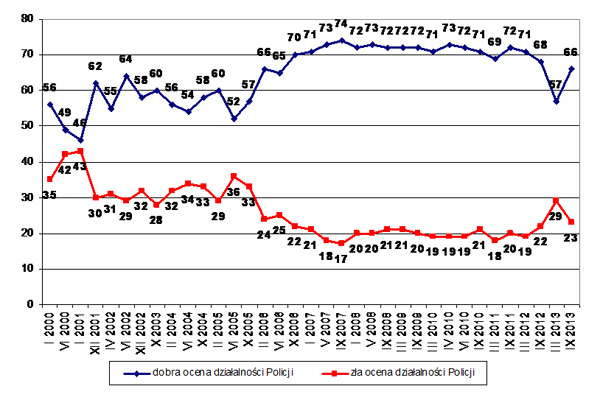 Większość Polaków dobrze ocenia działalność Policji. Z badania dotyczącego oceny instytucji publicznych, zrealizowanego przez Centrum Badania Opinii Społecznej w dniach 5 – 12 września 2013 roku, wynika, że lepiej od Policji oceniane są jedynie niektóre media.