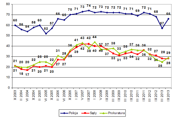 Od 1996 roku Polacy pytani są o zdanie na temat działalności najważniejszych instytucji publicznych w kraju, takich jak parlament, urząd prezydenta czy Policja. Badani oceniali również władze samorządowe, kościół rzymskokatolicki, związki zawodowe, ZUS i OFE, instytucje finansowe, wojsko, instytucje wymiaru sprawiedliwości, Trybunał Konstytucyjny, Najwyższą Izbę Kontroli, Rzecznika Praw Obywatelskich, PKP oraz najpopularniejsze stacje telewizyjne i radiowe. Policja znajduje się na siódmym miejscu z dwudziestu dziewięciu ocenianych instytucji, wyżej od niej znajdują się tylko niektóre stacje telewizyjne i radiowe (wykres nr 3).