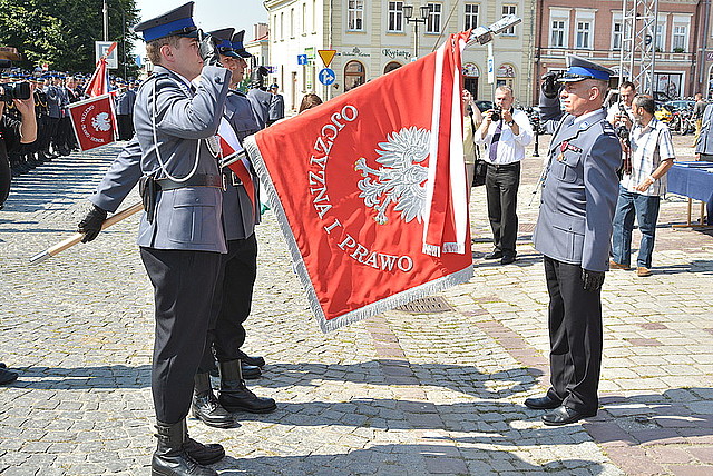 Wczoraj na jarosławskim Rynku odbyły się wojewódzkie obchody Święta Policji. Kulminacyjnym punktem uroczystości było nadanie sztandaru Komendzie Powiatowej Policji w Jarosławiu. Wręczone zostały także odznaczenia i awanse na wyższe stopnie służbowe. Policjanci odebrali życzenia, gratulacje i podziękowania. W tym roku Polska Policja obchodzi 95-lecie powstania (powołana została 24 lipca 1919 roku ustawą Sejmu II Rzeczypospolitej).