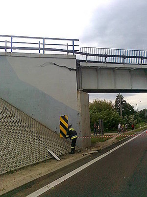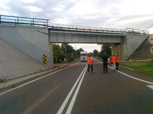 Do zdarzenia doszło około godz. 13 w Widełce w powiecie kolbuszowskim na drodze krajowej nr 9. Kierowca ciężarowego dafa przewoził koparkę, której ramię zahaczyło o wiadukt kolejowy. Wiadukt został poważnie uszkodzony. Droga krajowa nr 9 przez prawie cztery godziny była zablokowana. Po zabezpieczeniu wiaduktu, ruch kołowy został przywrócony. Policjanci przebadali kierującego dafem na alkomacie. Urządzenie wskazało, że mężczyzna był trzeźwy.