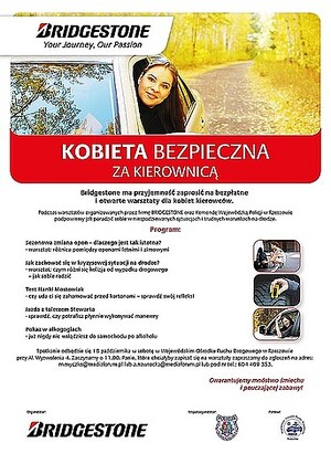 Komenda Wojewódzka Policji w Rzeszowie wsparła akcję "Kobieta bezpieczna za kierownicą", zorganizowaną przez firmę Bridgestone. W jej ramach już dziś w Rzeszowie odbędą się bezpłatne warsztaty, w czasie których panie będą mogły np. przećwiczyć skuteczne hamowanie i jazdę w poślizgu.