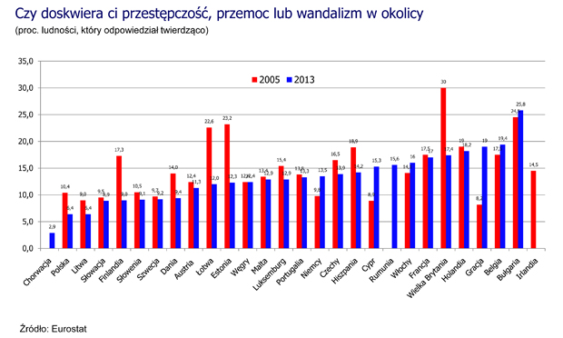 Według Eurostatu bezpieczniej od Polaków w miejscu zamieszkania czują się tylko Chorwaci. Prześcignęliśmy Skandynawów, stawianych za wzór społecznego porządku, Niemcy, Holandię i Wielką Brytanię – czytamy w „Dzienniku Gazecie Prawnej”. Przemoc, przestępczość lub wandalizm stanowią zagrożenie dla zaledwie 6,4 proc. Polaków.