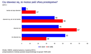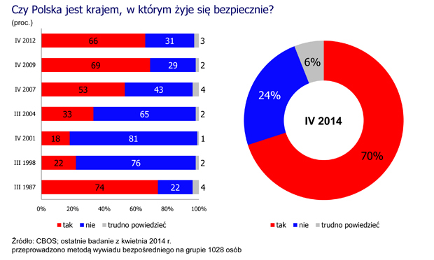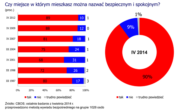 Duże poczucie bezpieczeństwa odnotowują też inne sondaże: np. w kwietniowym badaniu CBOS dziewięciu na dziesięciu badanych deklarowało, że czuje się bezpiecznie w swojej okolicy. Poziom poczucia bezpieczeństwa należy do najwyższych w całym okresie III RP.