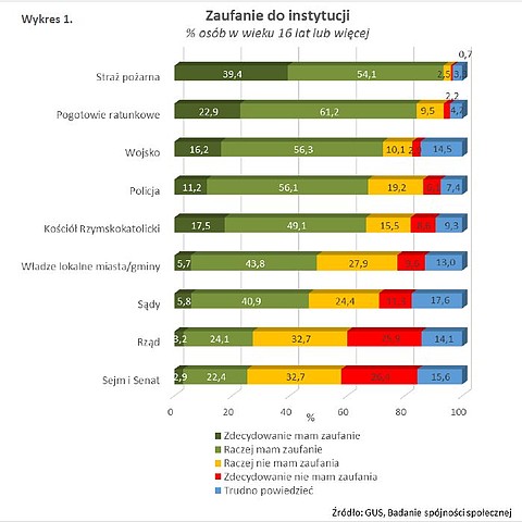 W pierwszej połowie 2015 r. największym zaufaniem wśród mieszkańców Polski (wybór na skali odpowiedzi „zdecydowanie mam zaufanie” lub „raczej mam zaufanie”) cieszyły się służby ratunkowe. Zaufanie do straży pożarnej deklarowało ok. 94% osób w wieku 16 lat lub więcej, natomiast do pogotowia ratunkowego - ok. 84% osób. Dosyć wysoki był również poziom zaufania do Wojska (ponad 72%) oraz do Policji i do Kościoła Rzymskokatolickiego (po ok. 67%). Ponadto należy zauwazyć, iż w przypadku straży pożarnej, pogotowia ratunkowego oraz Kościoła Rzymskokatolickiego odnotowano najwyższe odsetki osób, które zdecydowanie mają zaufanie do tych instytucji (odpowiednio: ok. 39%, ok. 23% oraz ok. 18%)