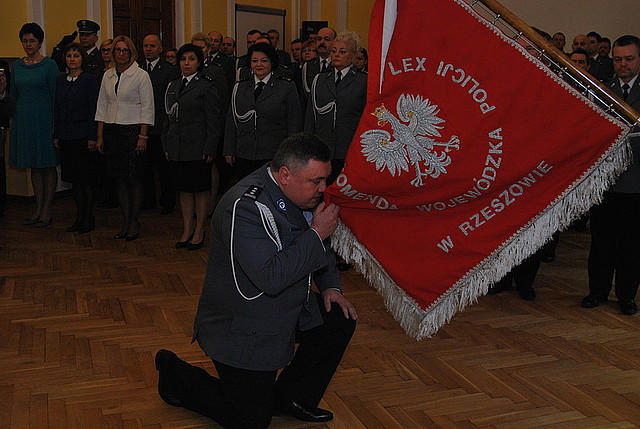 Zawodową biografię nowego komendanta podkarpackiej policji przedstawił inspektor Zbigniew Maj, a zaraz potem wręczył inspektorowi dr Krzysztofowi Pobucie decyzję ministra. Komendant Pobuta przywitał się ze sztandarem Komendy Wojewódzkiej Policji w Rzeszowie.
