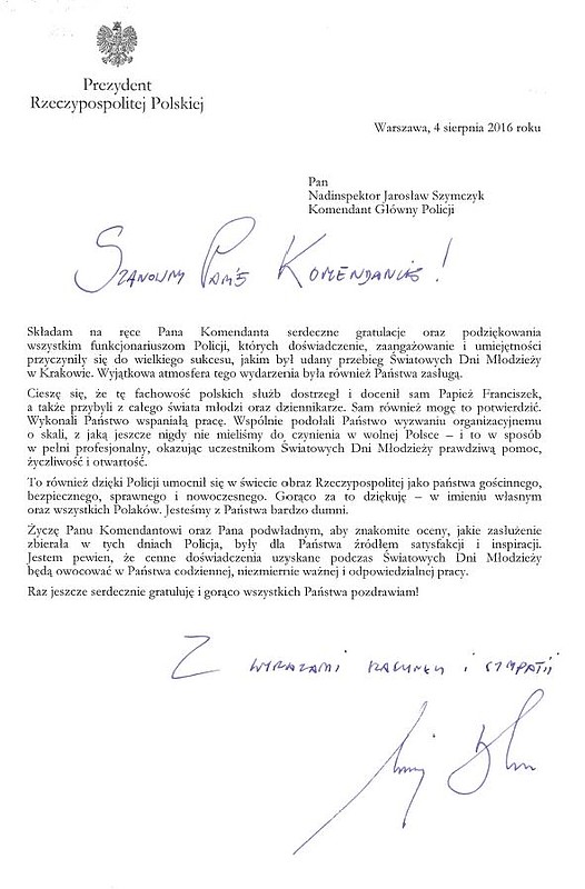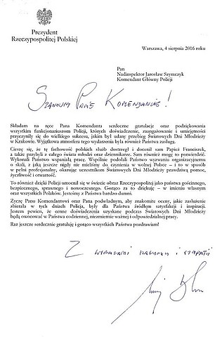 Prezydent Rzeczypospolitej Polskiej Andrzej Duda przesłał na ręce Komendanta Głównego Policji nadinsp. Jarosława Szymczyka gratulacje i podziękowania dla wszystkich policjantów, pełniących służbę podczas Światowych Dni Młodzieży.