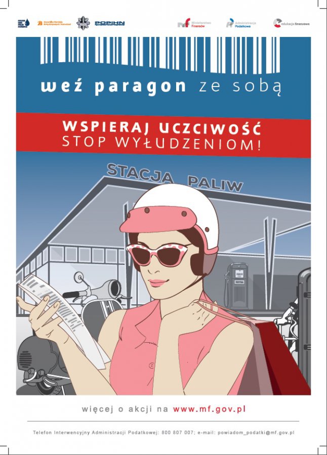 Pod hasłem „Weź paragon ze sobą” w całym kraju rusza ogólnopolska kampania informacyjna Ministerstwa Finansów. Akcja ma uświadomić Polakom z czym wiąże się nie wydawanie paragonów fiskalnych na stacjach paliwowych i nie zabieranie ich ze sobą w przypadku otrzymania. Kampania prowadzona będzie od września do listopada 2016 roku.