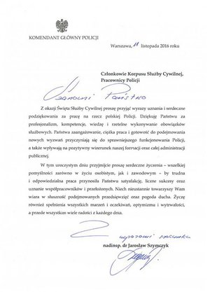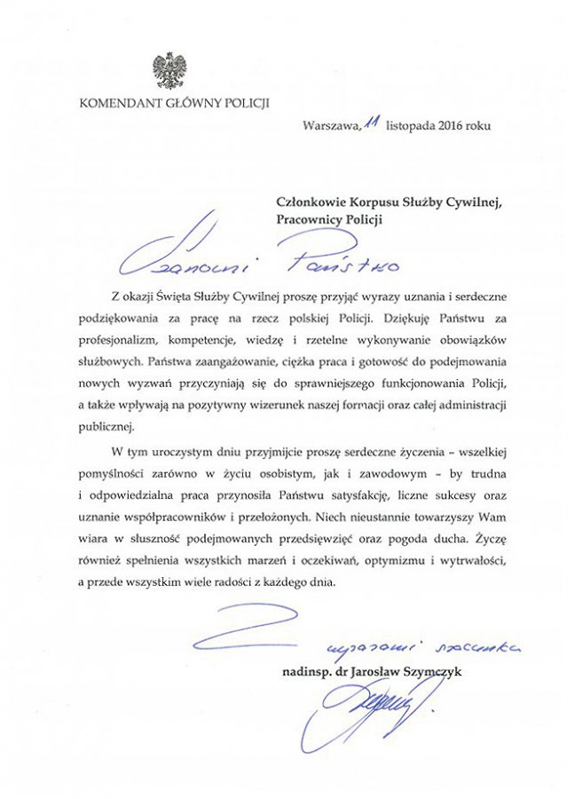 Komendant Główny Policji nadinsp. dr Jarosław Szymczyk z okazji Święta Służby Cywilnej wystosował list do wszystkich pracowników Policji, dziękując im za sumienną pracę na rzecz Policji.