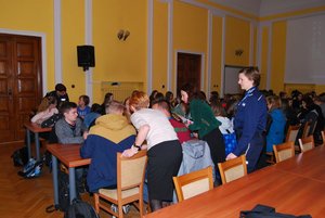 Podkom. Renata Bednarska mówiła o bezpieczeństwie w ruchu drogowym. Za pomocą prezentacji przedstawiła najczęstsze przyczyny wypadków i zdarzeń drogowych z udziałem samochodów i motocykli. Podkreślała, że niejednokrotnie brawura i przecenianie swoich możliwości prowadzi do tragicznych w skutkach następstw. Przypominała młodzieży, że sami także są odpowiedzialni za własne bezpieczeństwo. Nie sprzyjające warunki atmosferyczne, szybko zapadający zmrok powodują, że jako piesi stajemy się nie widoczni dla innych uczestników ruchu drogowego, dlatego podkreślała jak ważne jest, aby pamiętać o elementach odblaskowych i stosowaniu się do obowiązujących przepisów.