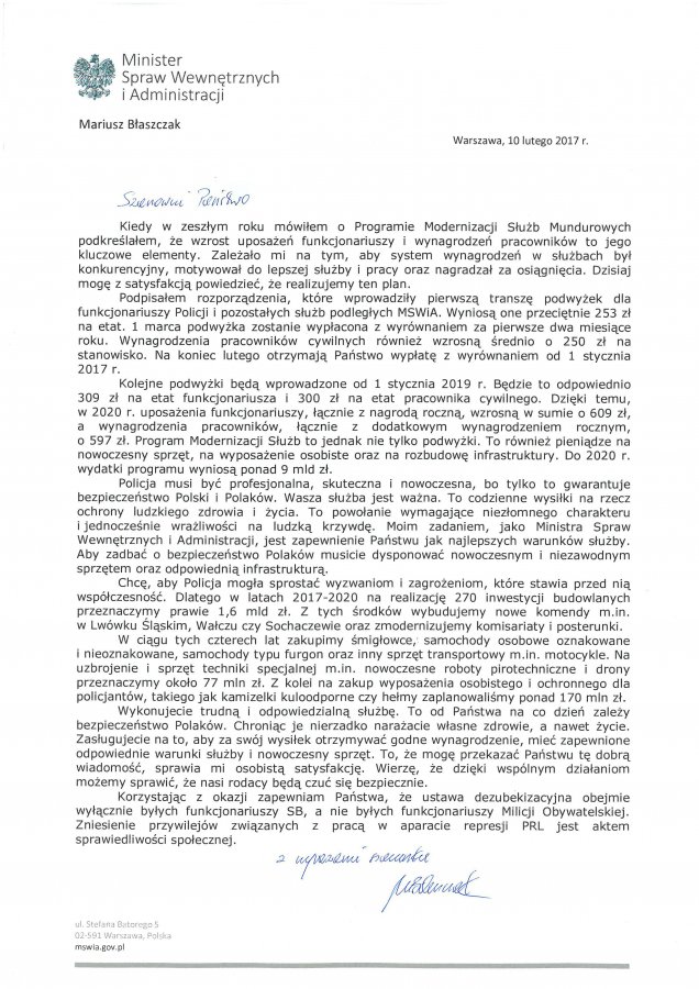 List Ministra Mariusza Błaszczaka do policjantów Data publikacji 17.02.2017 Powrót Drukuj Minister Spraw Wewnętrznych i Administracji Mariusz Błaszczak o usprawnieniu, rozwoju i inwestycjach w Policji oraz systemie motywacyjnym.