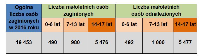 W 2016 roku Policja odnotowała 19 453 zaginięć osób, z czego 6 946 stanowiły dzieci poniżej 18 roku życia. Liczba ta utrzymuje się na podobnym poziomie od kilku lat. Warto tutaj podkreślić, że większość z nich wraca do domu cała i zdrowa. Na Podkarpaciu w 2016 roku zaginęło 207 dzieci. Najmłodszych w wieku do 6 lat zaginęło 24, w wieku od 7 do 13 lat - 27 i od 14 do 17 lat - 156.