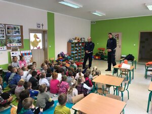 Dzisiejsze spotkanie z najmłodszymi policjanci wykorzystali do ich edukacji na rzecz bezpiecznego zachowania się na drodze w ramach prowadzonych działań "Rowerem Bezpiecznie". Dzieci przypomniały sobie jak bezpiecznie przejść na drugą stronę jezdni, po co nosić elementy odblaskowe, poznały też znaki drogowe i ich znaczenie dla pieszych i kierowców.