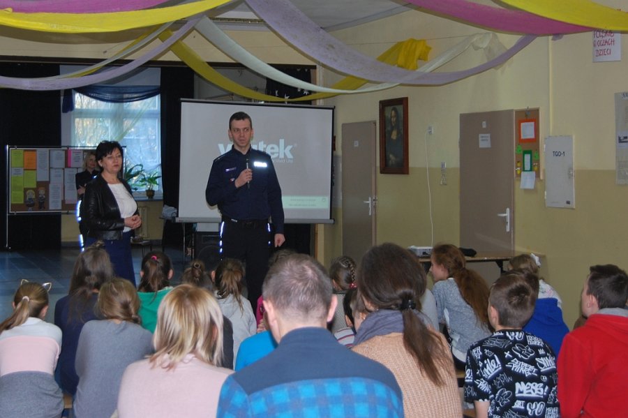 Asp. Jerzy Ossoliński rozmawiał z młodymi ludźmi o niebezpieczeństwie, jakie może nieść ze sobą cyberprzemoc. Mówił o przestępstwach popełnianych w cyberprzestrzeni. Przedstawił również zasady bezpiecznego komunikowania się za pośrednictwem Internetu.