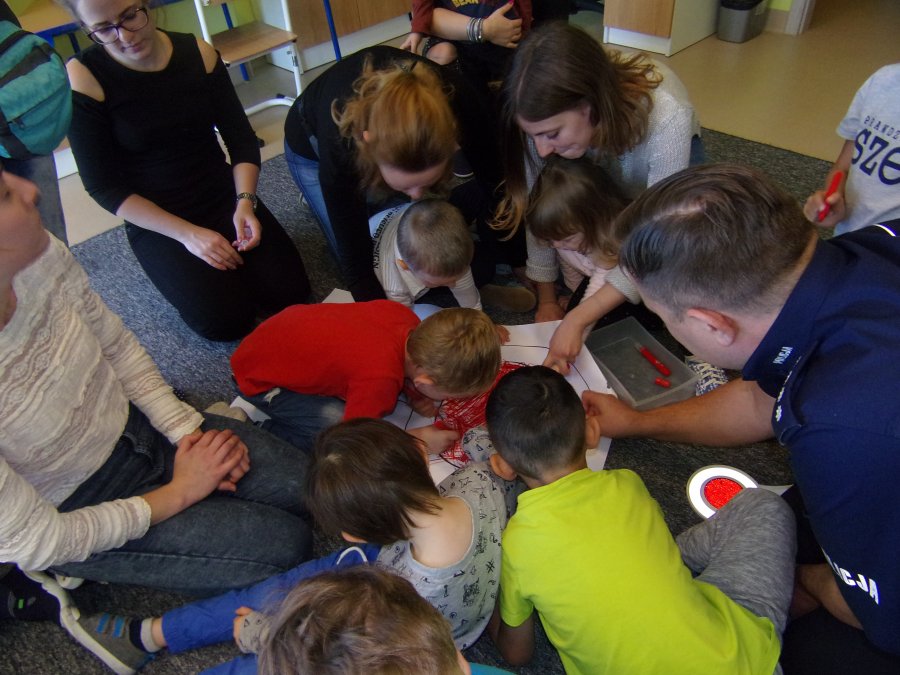 Dla małych słuchaczy przygotowano specjalne plansze, które przedstawiały sygnalizację świetlną. Dzieci poprzez kolorowanie świateł, dowiedziały się jak bezpiecznie przechodzić przez pasy. Przedszkolaki dowiedziały się między innymi jaki jest numer alarmowy na policję. Policjanci omówili także rolę dyżurnego i podkreślali jak ta funkcja jest ważna podczas przyjmowania zawiadomienia. Mundurowi omówili także na co należy zwrócić uwagę podczas zgłaszania interwencji. Podczas spotkania funkcjonariusze mówili jak być bezpiecznym, nie tylko w przedszkolu, ale także podczas spacerów i zabawy w domu.
