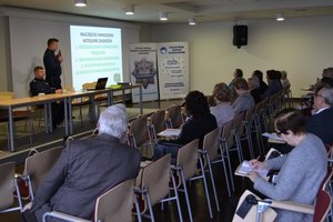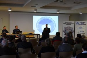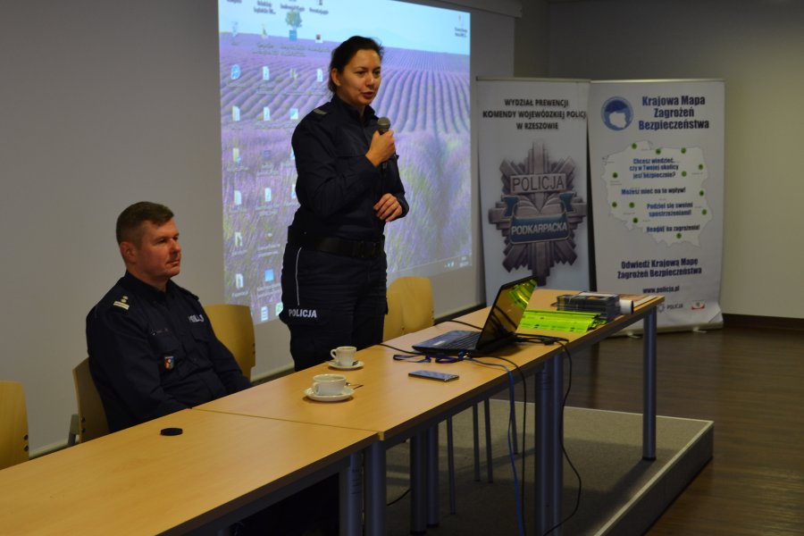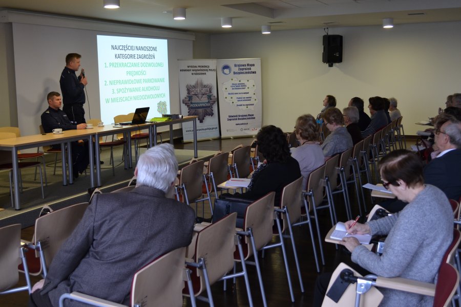 Pierwszym prelegentem był mł. asp. Marek Bytnar z Wydziału Prewencji Komendy Wojewódzkiej Policji w Rzeszowie, który w swoim wystąpieniu przybliżył temat funkcjonowania Krajowej Mapy Zagrożeń Bezpieczeństwa. Zaprezentował również praktyczną obsługę Krajowej Mapy Zagrożeń Bezpieczeństwa, w tym sposób zgłoszenia w aplikacji konkretnego zagrożenia, co bardzo zainteresowało seniorów.