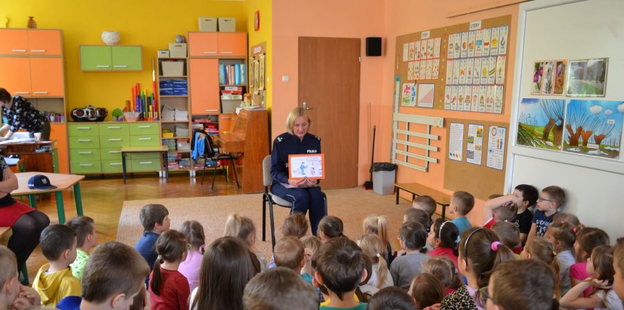 Dzieciom zostały przypomniane zasady bezpiecznego korzystania z drogi oraz numery alarmowe i ich przeznaczenie. W trakcie spotkania dzieci otrzymały kolorowanki dotyczące pracy policjanta, które sprawiły im dużą radość.