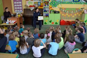 W trakcie przeprowadzonych spotkań w poszczególnych grupach przedszkolaków podinsp. Alina Pieniążek i sierż. szt. Karolina Dykas przekazały dzieciom informacje dotyczące unikania zagrożeń w różnych sytuacjach społecznych, właściwych zachowań w grupie rówieśniczej, w czasie kontaktu z nieznajomym i podczas kontaktu z agresywnym psem.