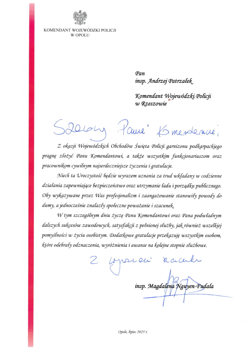 Podziękowania od Komendanta Wojewódzkiego Policji w Opolu, insp. Magdaleny Nguyen-Fudali Powrót Drukuj