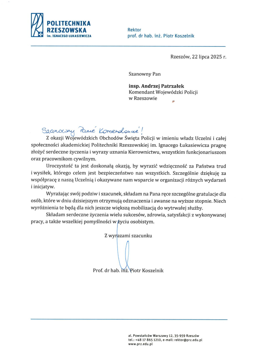 Podziękowania i życzenia od Rektora Politechniki Rzeszowskiej