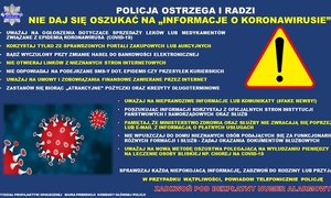W związku z rozprzestrzenianiem się pandemii koronawirusa funkcjonariusze Biura Prewencji Komendy Głównej Policji apelują o zachowanie ostrożności i rozsądku oraz przestrzegają przed oszustami. Pamiętajmy, że przestępcy, wykorzystując obawę i niepewność związaną z epidemią, chcą wyłudzić pieniądze lub wprowadzić dezinformację, zasypując sieć oraz media fałszywymi informacjami, czyli fake newsami.